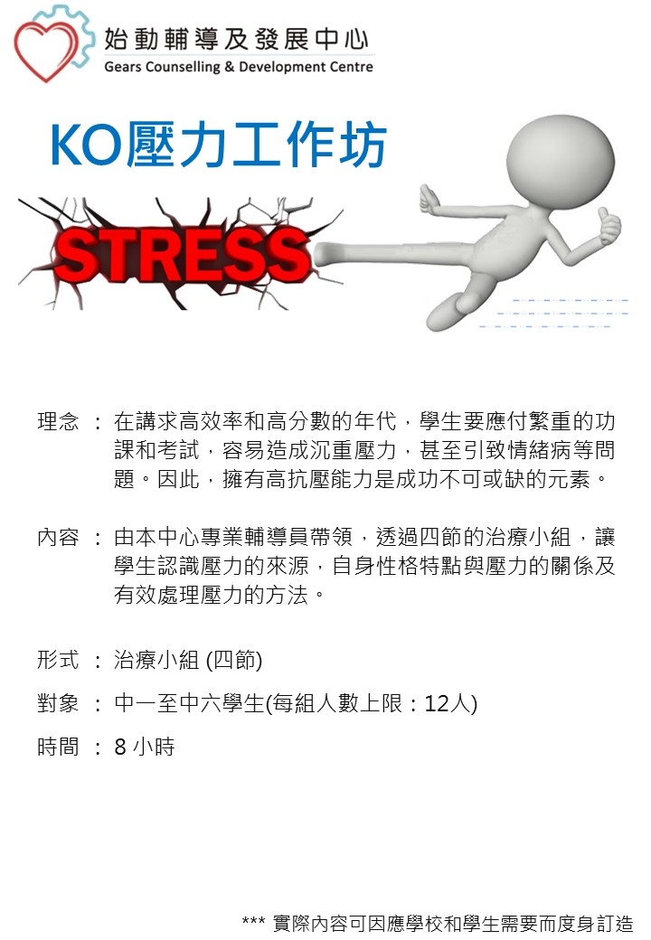 工作坊會由專業輔導員帶領,透過四節的治療小組,讓學生認識壓力的來源,自身性格特點與壓力的關係及有效處理壓力的方法。