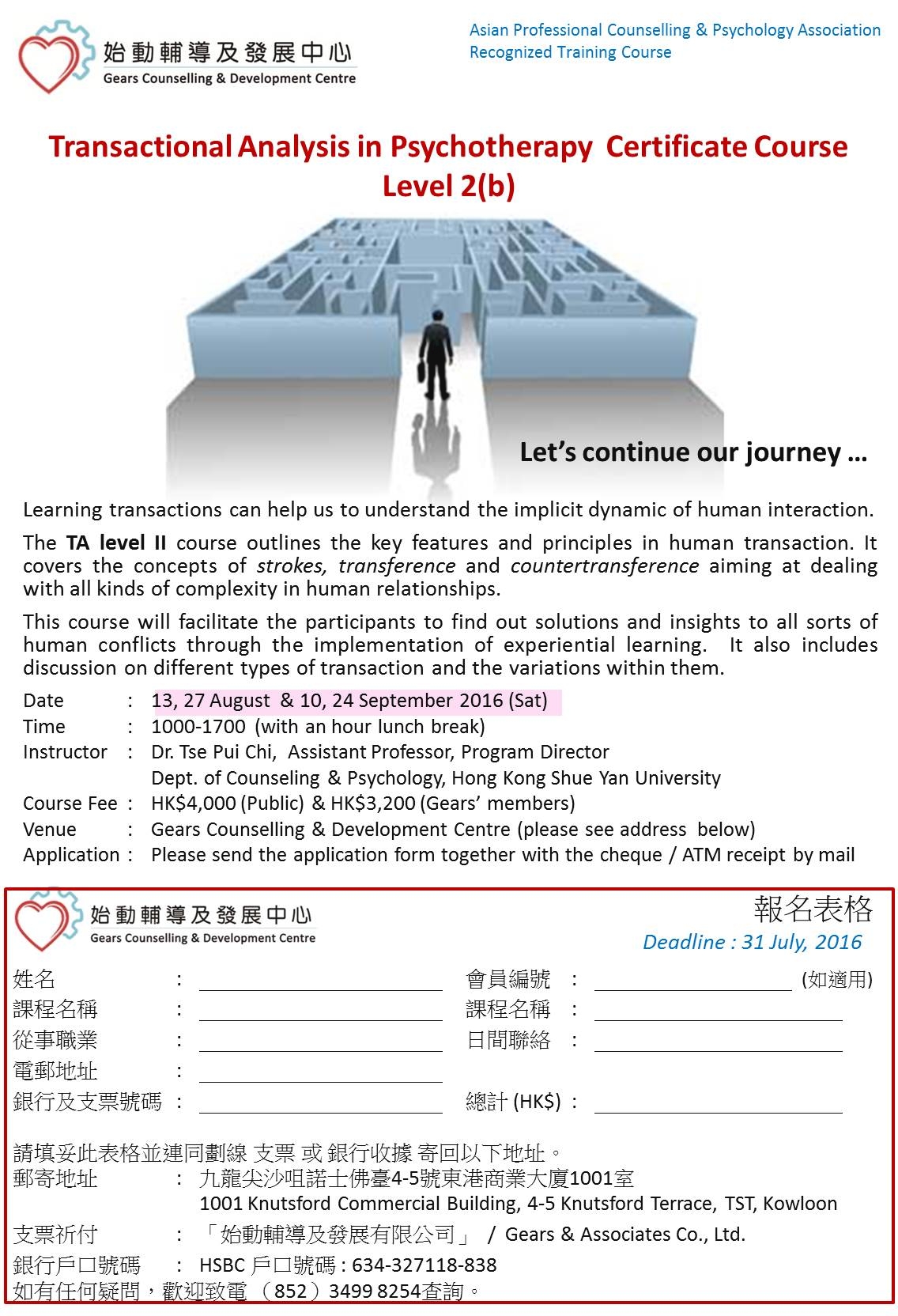 曾讀過Transactiomal Analysis的朋友,我們還有很長的學習之路需要行,如你想在深造這方面的知識,請儘快報名和我們一起學習吧。